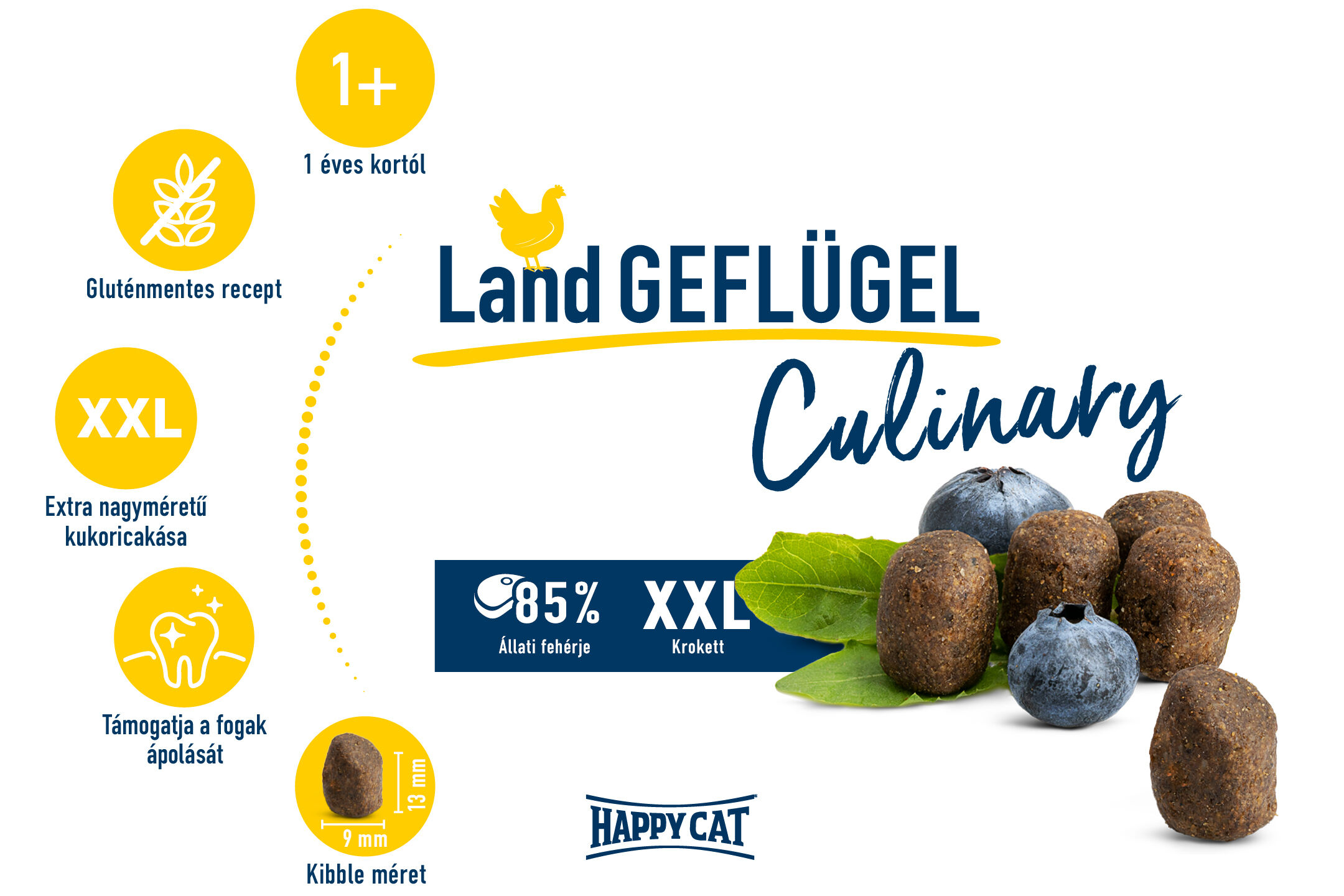 A Happy Cat Culinary Land-Geflügel (Baromfi) XL méretű tápszemei szándékosan nagyobbak egy kicsit. Nemcsak kellemes változatosságot nyújtanak az eledeles tálban, hanem gondoskodnak arról is, hogy macskád intenzívebben rágja meg a szárazeledelt, és ne falja fel túl gyorsan. Ez könnyebbé teszi az eledel megemésztését a gyomorban. A tápszemek a rágóizmokat is stimulálják, egyúttal támogatják a fogápolást.